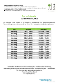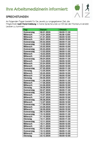 Ihre Arbeitsmedizinerin informiert: SPRECHSTUNDEN An folgenden Tagen besteht für Sie, jeweils zur angegebenen Zeit, die Möglichkeit nach Voranmeldung in meine Sprechstunde vor Ort bei der…